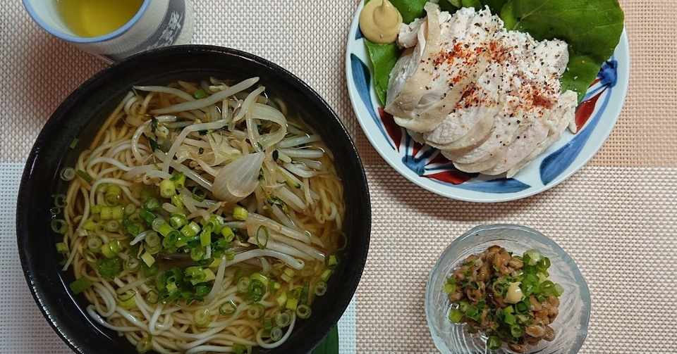 夕ご飯は鶏ハム 温かいひやむぎ 納豆 ๑ ๑ チュルチュル ウズ Note